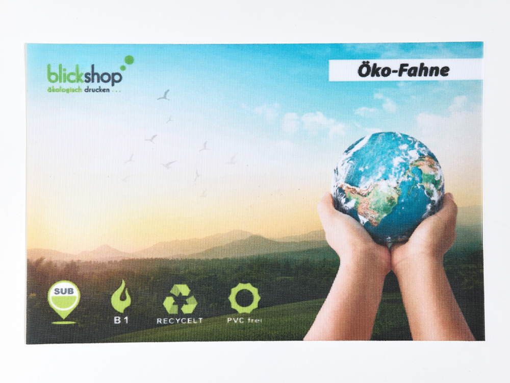 Bei den Öko-Fahnen von blickshop ist der Polyesterstoff aus 100 Prozent Recyclingmaterial. PET-Flaschen werden nach Gebrauch zerkleinert und die kleinen Kunststoffteile eingeschmolzen. In flüssigem Zustand entsteht aus dem Kunststoff ein Faden, die Grundlage für das neue Gewebe. Der Vorteil: Vorhandene Ressourcen werden wieder verwendet, es wird kein neues Erdöl benötigt und pro Kilo wiederverwertetes PET kann bis zu 3 Kilogramm CO2 eingespart werden. Das Gewebe ist speziell für den Außeneinsatz, leicht und reißfest sowie schnell trocknend. Die Oberfläche ist leicht glänzend.